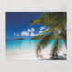 Convites de casamento de destino de praia de orçamento com um paraíso tropical, cenário de praia arenoso, estrelas-do-mar, elegantes lamparinas, palmeiras, um porto floral de madeira e um modelo de casamento moderno.