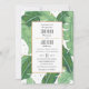 Um convite de casamento moderno apresenta ilustrações de folhas de bananas e folhas falsas.