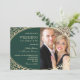 Um convite de casamento verde esmeralda, luxo, moderno, deco, elegante com vintage e foto de noiva e noivo.