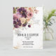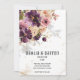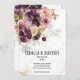 Um moderno e elegante buquê floral roxo e aquarela mauve com sua sombra suavemente derramando no convite e espumantes pedaços e elementos de ouro, com seus primeiros nomes em uma fonte moderna com uma data numérica de casamento embaixo e uma pequena fonte para os detalhes. Este luxo violeta, roxo e mauve convite é adequado para qualquer ocasião.