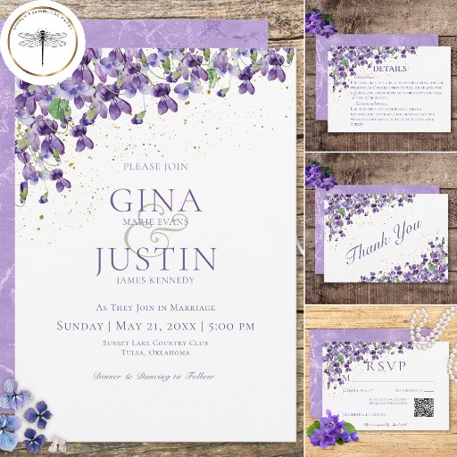 Violetas simples e bonitas trazem o topo deste convite. Com um pouco de efeito de brilho dourado, é clássico e elegante. O apoio é um olhar violeta macio marmoreado, com um toque de nadador. Bonita para um casamento de verão, ou qualquer casamento onde roxo é a cor principal.