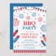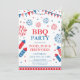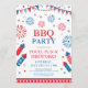Convite para festa de churrasco festivo do Dia 4 de Julho com moldura, bandeiras e fogos de artifício isolados em fundo branco. Design para convites do Dia da Independência Americano. Tipografia personalizável em vermelho e azul.