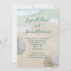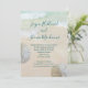 Convites de casamento na praia com desenho de dólares de areia. Areia de praia e água azul-esverdeada tropical são o fundo para o texto. Os nomes completos do casal, em escrita moderna à mão, no topo do papel, com um parágrafo de texto impresso abaixo. Espaço de texto suficiente é fornecido para um endereço de recepção e / ou site de casamento / outras informações. A redação é perfeita para uma reunião pequena e casual. Dólares de areia branca natural decoram as bordas.
