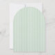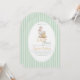 Este convite de chá de bebê encantador apresenta uma ilustração em aquarela vintage suave de uma Mãe Gansa e seu ganso, criando uma história calorosa e terna de amor e cuidado. A delicada obra de arte é emoldurada em uma forma oval elegante e colocada em um fundo listrado clássico em verde pastel, inspirado em designs atemporais de berçário e livro de histórias.