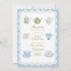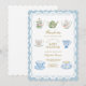 Este convite de chá de bebê elegante apresenta um tema encantador de festa do chá com bule e xícaras de chá lindamente ilustrados em padrões florais suaves. A tipografia azul delicada combinada com tons pastéis cria um design atemporal e gracioso, perfeito para celebrar uma futura mamãe.