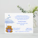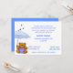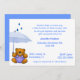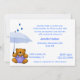 É um convite para chás de aspersão. Gráficos de desenho de um ursinho de pelúcia marrom, em macacos azuis e segurando um guarda-chuva azul, decoram o lado inferior esquerdo deste convite branco. Gráficos de três gotas de chuva estão caindo sobre o guarda-chuva. O texto em azul está pronto para personalizar o evento de chá de fraldas. É um convite encantador para a mãe ser salva para sempre, com as chaves do novo bebê.