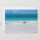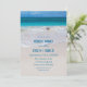 Bonito água do oceano azul e convites para chás de casamento da praia arenosa. Modelos personalizados em azul sobre a areia da praia podem ser para qualquer tipo de casamento tropical ou evento especial. Atualize o papel, se desejar. Os envelopes brancos estão incluídos.