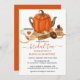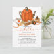 Um bule de abóbora de laranja festivo toma palco central neste convite para o chá de outono.