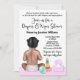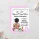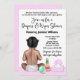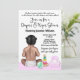 Fralda de convite para chá de fraldas com uma doce menina com brinquedos em um fundo de pontos rosa giro.