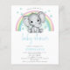 Convite para Chá de fraldas Azul Arco-Íris de Orçamento Elefante. NOTA Há duas opções de papel a escolher para este tamanho (4,5 x 5,6") na faixa de Orçamento. Para este produto, eu recomendaria muito o semibrilho, que é um estoque de cartão de 110 gsm, semelhante em espessura a um cartão postal. A opção Satin é um papel muito mais fino, 80gsm. O padrão é definido como semirbrilho. O chá de fraldas está em um script definido e personaliza facilmente o resto do texto.