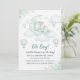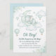 Celebre a chegada de um bebê com este anúncio charmoso de chá de fraldas com um elefante bebê dormindo em uma lua crescente cercado por balões de ar quente verde-claro e verde-claro e estrelas douradas. O design, com seu esquema de cor suave e folhas e galhos delicados, cria uma estética pacífica e caprichosa. A mensagem 'Oh Boy! Um pequeno amendoim está no caminho!' em uma letra ousada e estilizada adiciona um toque de entusiasmo a esse adorável cartão de saudação. Perfeito por receber o mais novo membro da família!