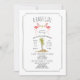 Um convite de chá de fraldas com ilustração de dois flamingos segurando bunting. O Convite também apresenta uma ilustração de uma ilha com palmeiras. Personalize o texto.