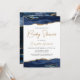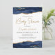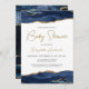 Este convite de chá de fraldas de tendência apresenta uma borda superior e inferior do geode de agate de cor d'água em tons de azul marinho com realces de brilho dourado falsos. As palavras "Chá de fraldas" e o nome da futura mãe aparecem em letra dourada. Adicione os detalhes da parte em cinzas de carvão em um fundo branco. Uma imagem azul e dourada do marinho correspondente aparece no lado oposto.
