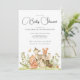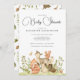 Um belo e fofo cartão de convite para Chás de fraldas, com uma cor de água, animais da floresta, design, com raposa, cervo, coelho, esquilo e ouriço. Uma fonte impressionante de script é usada que parece na moda, elegante e sofisticada. Esta peça clássica está pronta para você personalizar com os detalhes do seu evento especial. Fontes e cores de fontes podem ser alteradas se você desejar ou sair conforme mostrado aqui.