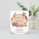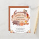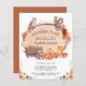 Convite para chá de fraldas, com tema de outono, rústico e orçamental, com coroa aquosa composta por um tronco de árvore, aquarelas bonitinhas de animais da floresta (coruja, esquilo, urso e raposa), e flores de folhagem e abóboras. "Aguardam" e o nome da futura mãe está escrito em um roteiro de terracota.