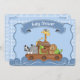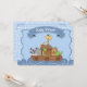 Convite de Chá de fraldas de Arca de Blue Noah para Meninos. Design tem um fundo xadrez azul claro, um cheio de arca de animais e um banner com as palavras chá de fraldas.