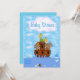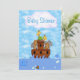 Convite para Chá de fraldas de Arca de Noah com o barco e animais de Noah que incluem duas girafas, duas zebras, dois leões, dois elefantes, uma tartaruga e um peixe.