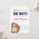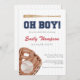 Está a caminho uma pancada! Este convite para o chá de fraldas de beisebol "Oh Boy" apresenta tons azuis clássicos, gráficos de taco e bola vintage, e charme esportivo. Perfeito por receber seu bebê em casa.