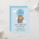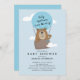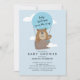 Urso bonito voando em um convite de chá de fraldas para meninos de balão de ar quente.
