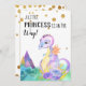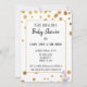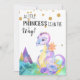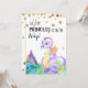 Este chá de fraldas de convite a design de de tem um doce dinossauro / dragão com um fundo de um ponto de confete de ouro mágico e montanhas mágicas.