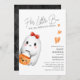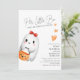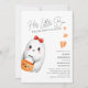 Um convite para o chá de fraldas de Halloween super bonito com um fantasma adorável segurando um truque ou tratando abóbora. A Tipografia diz que seu pequeno boo chegará em breve! Isto é perfeito para o seu chá de fraldas de tema de halloween. Veja a coordenação de itens no nosso compro, Encantado Finch.