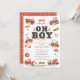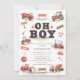 Design de Chá de fraldas "Ah Boy" com caminhões de construção vermelhos com placas de construção e ferramentas. Visite nosso compro para ver este design em outras cores.