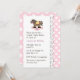 O convite para o chá de fraldas do Na moda é feito em formato 3D em camadas, com um padrão de bolinhas rosa e branco, na parte inferior e uma área de texto em branco na borda escalada, à esquerda. os gráficos de uma fita de cetim branca parecem estar tecidos para dentro e para fora ao longo da borda recortada e de um cavalo de balanço marrom e rosa, decorando o meio superior da área de texto branca. O texto está pronto para personalizar o evento especial. Um convite adorável para o casal.