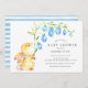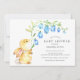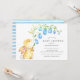 Belo design de chá de fraldas de aquarela com o mais doce coelho bebê segurando um caule de flor azul. Sacudir nosso adorável chá de fraldas convidar para ver uma coordenação de volta para um toque especial.