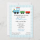 Um convite para chás de fraldas bonito feito em tons de azul e branco.  A frente tem um fundo de gingham azul e branco.  Um trem de brinquedo azul fica no topo. Você personaliza o texto.  As costas têm o padrão de gingham azul com uma versão maior do brinquedo.  Perfeito para qualquer chá de fraldas para um bebê.