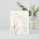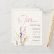 Um convite à chá elegante e amigável para bebês de creme claro que apresenta "um pequeno flor selvagem está a caminho" escrito na moderna tipografia suave e num roteiro cor-de-rosa na moda, e um buquê de aquarela inspirado no ventre de flores roxas, rosa e amarelas delicadas.