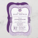 É uma garota! Chá de fraldas de coruja roxa, lavanda entre pernas elegantes, convida para faixas verticais roxas e padrões de bolinhas roxas escuras e brancas com aparência formal vintage. Excelente para chás de fraldas temáticos de coruja; perfeito para chás primavera. Convite de forma de colchete retrô.