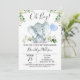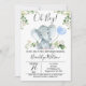 Convite para Chá de fraldas Elefante de Aquarela de Menino Este convite para chá de fraldas de elefante de aquarela de menino apresenta um elefante giro, um balão azul de bebê e alguma folhagem verde em um fundo branco. Ideal do chá de fraldas do elefante de um próximo menino.