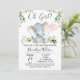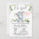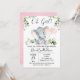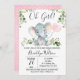 O convite para o chá de fraldas de elefante a aquarela desta menina apresenta um elefante giro, um balão cor-de-rosa em forma de coração e alguma folhagem verde em um fundo branco. Ideal de um chá de fraldas teórico de elefante de uma garota.