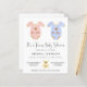 Celebrar a futura mãe de gêmeos de meninas e meninos com este convite de chá de fraldas amigável com orçamento que apresenta cores pastel rosa, azul e douradas de roupas de macacão de bebê com uma única peça com "É uma Menina!" e "É um Menino!" escritos em cada uma delas (você pode mudar isto ou deixar vazio). "É um Chá de fraldas Gêmeo" é escrito por baixo em um roteiro na moda contemporâneo. Uma pequena aquarela pastel amarela e dourada de um ursinho de pelúcia no fundo do convite separa a localização do partido e os detalhes de RSVP.