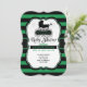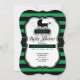 Um convite para o chá de fraldas de Halloween com listras verdes e pretas, uma carruagem de bebê e teias de aranha.