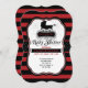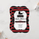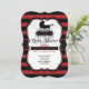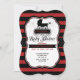 Um convite para o chá de fraldas de Halloween com listras vermelhas e pretas, uma carruagem de bebê e teias de aranha.