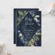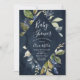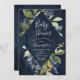 Convite para Chá de fraldas botânico que enquadra os detalhes do convite com uma borda de folhas de cor d'água, flores azuis e folhagem verde em fundo de marinho d'água.