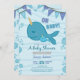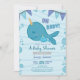 festa como um narwhal! Celebre seu aniversário com nosso Convite de festas Narwhal Adorável. Este unicórnio fofo do chá de bebê narwhal apresenta um narwhal e seu bebê narwhal nadando em uma espuma azul-oceânica. Esta piscina de verão é perfeita para a sua festa do tema Narcwhal, festa do tema oceânico, convites para chuveiros náuticos de bebês, chá de fraldas temático de unicórnio marinho.