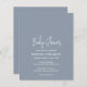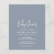 Convite moderno de chá de fraldas de orçamento azul empoeirado com um simples design com o título do evento em uma tipografia elegante de script e seus detalhes de evento em uma fonte minimalista sans serif. Este convite para o chá de fraldas chic é perfeito se você está tendo um bebê.