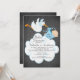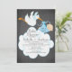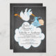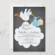 Um convite para chá de fraldas de um bebê bebezinho, bonito, com uma cegonha voadora segurando um pacote de bebês azuis com uma nuvem enorme em um quadro negro. A parte de trás do nosso convite tem uma cegonha igual a um bebê. Visite nosso compro para ver este convite para chás de fraldas de meninos de quadro-negro em escolhas populares e para autocolantes de chás de fraldas, obrigado a anotar cartões e selos postais. ©JW Ilustrações