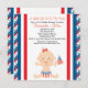 Firecrackers e fogos de artifício! Há um bebê a caminho! Comece a comemorar com este adorável convite para chás de fraldas. Tem estrelas e riscas vermelhas, brancas e azuis em cada lado com o centro branco. No centro de baixo está uma menina bonita em uma fralda vermelha, branca e azul e vestindo um arco vermelho em seu cabelo e segurando a bandeira americana em sua mão. Personalize com as informações de seu partido. Veja os outros designs e cores que oferecemos. ©JW Ilustrations