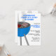 Convite personalizado divertido para o chá de fraldas do casal feito em branco, com gráficos de uma grelha azul de churrasco, no lado esquerdo e no verso. O texto em azul e preto está pronto para personalizar o evento de chá do seu bebê.