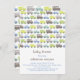 Este cartão plano de convite para chás de fraldas de criança giro e divertido apresenta uma ilustração simples dos brinquedos favoritos de criança, como carros retrorados, caminhões e padrões de ônibus em azuis claro, verduras de menta e cores de pastel de cinza leve.