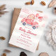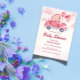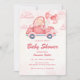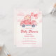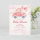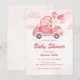 Celebre o seu pequeno a caminho com este convite de chá de fraldas rosa com um urso adorável a conduzir um carro decorado com coração rodeado por nuvens e balões. Com texturas aquáticas e uma paleta pastel macia, é a escolha perfeita para um chá de menina ou qualquer evento caprichoso. Ideal para: Celebrações de meninas chás de fraldas temerárias de Namorados e eventos de verão
