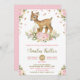 Convite para Chás de fraldas maravilhoso com a ilustração original em aquarela de um veado bebê e de flores rosadas e escamas femininas cor-de-rosa e confete em ouro falso