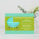 Rolante azul com rodas marrons sobre fundo verde com bordas de bolinhas de jade.