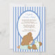 Chá de fraldas de urso de pelúcia bonito. Design apresenta o bebê mais bonito vestindo uma fralda segurando uma garrafa de bebê colocada sobre um fundo azul e branco de stripe. Correspondência entre selos e autocolantes disponíveis em nosso compro em www.clebrateitinvites.com