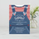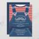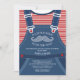 Um homenzinho está a caminho do Convite para Chás de fraldas com o par mais bonito de jardineiras com bigode. Chá de fraldas de Meninos Exclusivos.