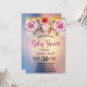 Convite para Chá de fraldas Floral Moderno Elegante. Design de elementos florais e chá de fraldas em script de tendência. O fundo está em tons cor-de-rosa e azuis cobertos de brilho dourado. Adicione detalhes da parte à frente. Clique em personalizar para editar fonte/ cor/ estilo ou mover texto etc.