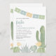 Um chá de fraldas de fiesta para honrar a futura mãe. Este convite temático do cacto apresenta um belo design do deserto de aquarela em tons delicados de azul empoeirado, amarelo e verde do deserto. Perfeito para uma festa de chá de fraldas a sudoeste ou moderna.